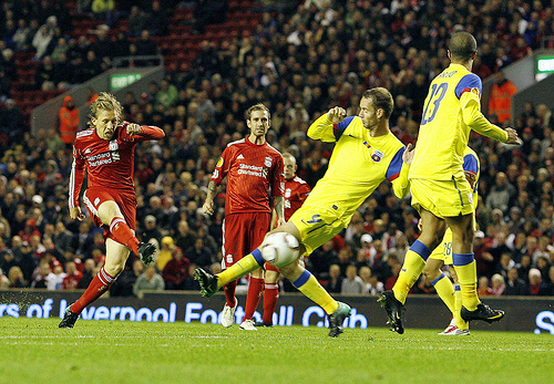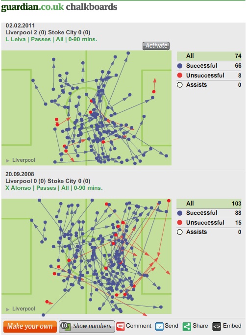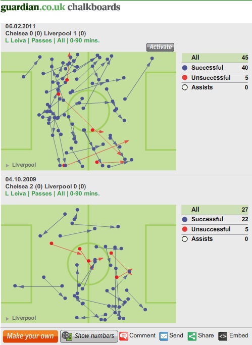 Since Dalglish’s arrival, Lucas has grown in confidence, aided by the improved form of Steven Gerrard and Raul Meireles. His passing accuracy in his five league matches under Dalglish has been 89% (Chelsea), 89% (Stoke), 79% (Wolves), 84% (Everton) and 78% (Blackpool). For comparison, the top passers in the Premier League this season have been John Obi Mikel (89%), Michael Essien, Alex Song (both 87%), Barry Ferguson (83%) and Danny Murphy (81%), but as seen above, Lucas has shown ambition in his passing, even if not quite at the standard of Xabi Alonso.