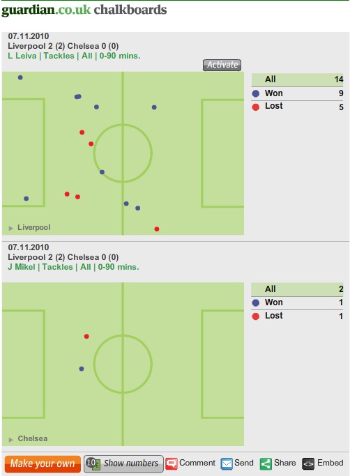 I think it’s fair to highlight how good and an important player Lucas is becoming to Liverpool, but it has been helped also by Raul Meireles stepping up to the plate. That plus using the Chelsea games as an example doesn’t necessarily tell the whole story, particularly in comparison to Mikel Obi. In the game at Anfield, it was one of our worst performances for quite a while, plus Chelsea spent most of the second half battering the door down so Mikel didn’t need to make tackles whereas Lucas did.