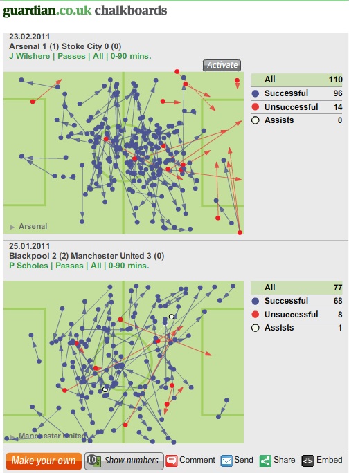 Whilst it’s easier to control a match against Stoke than other teams given the possession they surrender, the chalkboard shows great control over the midfield and an ability to play the ball in and into the final third (which could be working on given the 14 unsuccessful passes). Compare this to Paul Scholes, who showed a marvellous range of passing against Man City and Blackpool (above), and you can see the type of player Wilshere should aspire to become. He certainly has the passing ability. I also choose Paul Scholes because he’s famed for his inability to tackle, but is rightly admired for his other attributes. Why should the reckless edge to Wilshere’s game be encouraged?