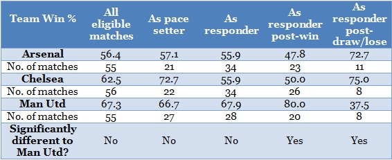 I found Chelsea to be the best pace setters, but poor responders along with Arsenal. Breaking responder statistics down further, Arsenal and Chelsea appeared remarkably more likely than Manchester United to win after a title rival had dropped points. Equally they appeared remarkably more likely than Manchester United to drop points after a title rival had won.