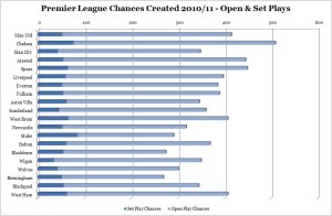 The original analysis focused on total chances created; that is those from both open and set plays. Unsurprisingly, the majority of chances created in the division last season were from open play.