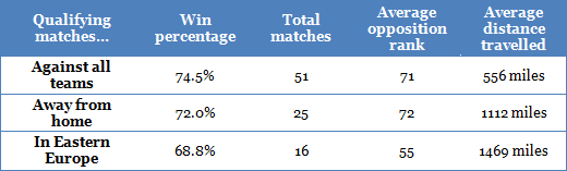 There’s no evidence to suggest that distance travelled for away games has had any impact on England’s qualifying (or indeed friendly) results over the past 10 years. All trips to Eastern Europe were over 800 miles*, the furthest being their near-3500 mile journey to Almaty, Kazakhstan.