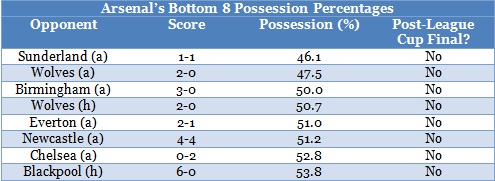 In an attempt to get to the statistical core of those problems, I stumbled across a slightly bizarre relationship: last season the Gunners enjoyed more success when they actually saw less of the ball.