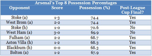 Not only was Arsenal’s win percentage significantly affected by their Wembley trauma, but their possession was too, increasing by a remarkable 6.7% on average in the league after that fateful Koscielny error.
