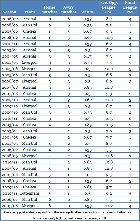 Credit must go to Roberto Mancini for not complaining (yet) about the scheduling; in the past Sir Alex Ferguson, Arsene Wenger and Jose Mourinho have all spoken out about a perceived unequal share of away matches. As this article shows, league scheduling is an issue that will never please everyone.