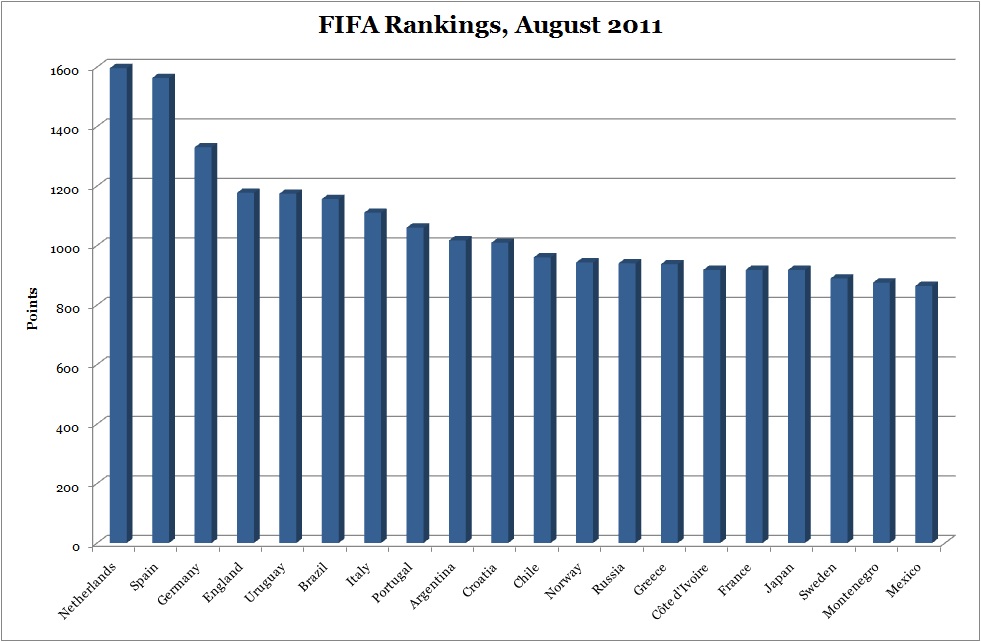 And so on. The difference in quality within each band is largely insignificant (though you could perhaps still argue England are a group too high); it strikes me that this is a better way of looking at the rankings.