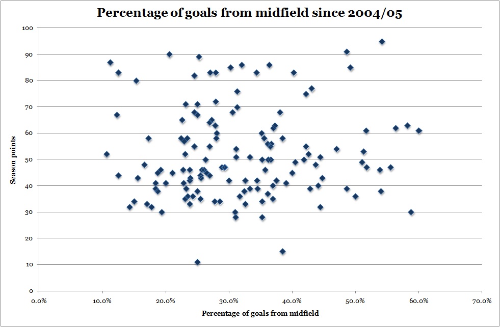 The problem with this chart is that there’s an obvious bias; better teams score more goals, and some of these goals must come from midfield. So do teams that score a larger percentage of their goals from midfield score more points? Not over the last seven seasons: