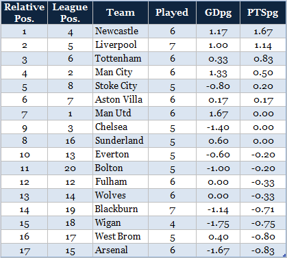The table highlights Newcastle as the overachievers thus far; whilst this is already indicated by the regular league table, it contradicts criticism that they have had it easy so far. Alan Pardew’s team has managed to improve in beating ‘weaker’ teams when they may have stumbled last season, a sure sign of progress.