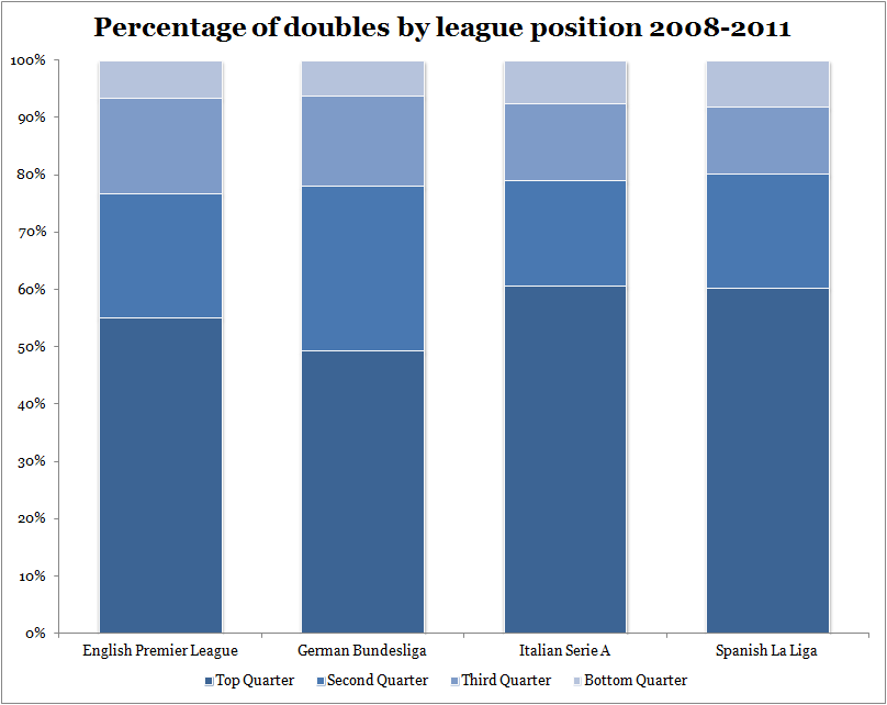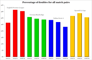 The Bundesliga exhibits perhaps the most even spread of doubles across the league, but as before the numbers are open to interpretation.