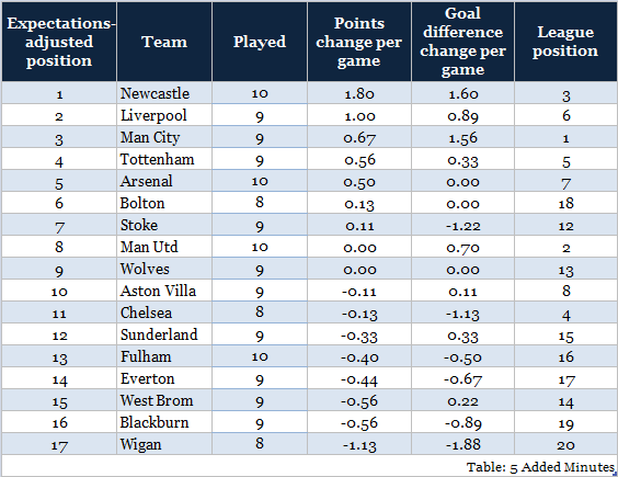 - Manchester United and Bolton weren’t doing as well/badly as the league table suggested, both virtually matching last season’s results.
