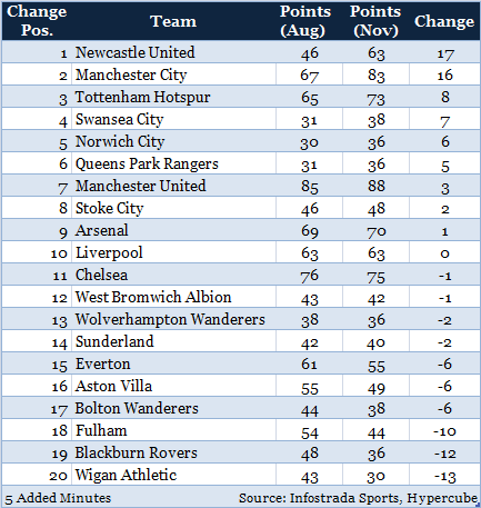 The comparative changes in predicted league table between the start of the season and November reflect and quantify opinion over who have been the under and overachievers thus far; but can the likes of Newcastle and Man City sustain form to match projections?
