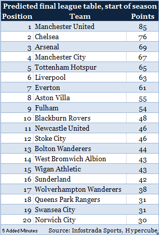 I think the prediction from the start of the season are very misleading or inaccurate. City had finished last season strongly with a team which was continuing to gel and improve. City then further strengthened in the transfer window with the addition of Arsenals best player from last season as well as an undoubted world class talent in Sergio Aguero. To have a table expecting that City would achieve 4 points less than the previous season given the points raised earlier is a joke. City finished level on points with Chelsea last year and were on an upward tragectory with Chelsea on a downwards one.