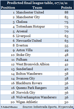 At the November international break, United are still backed as title winners, but Newcastle and Man City’s predicted improvements are evident, as are Wigan and Wolves’ regressions.