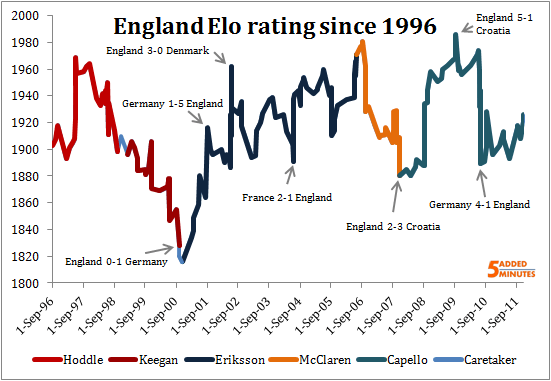 I use the Elo ratings for a consistent measure of England’s results. The trends are relatively clear; there was a decline from 1997 until the appointment of Sven Goran Eriksson, who guided England up towards the top of world football. Steven McClaren then took England backwards, whilst England’s erratic rating under Fabio Capello is because of the contrast in qualifying and tournament records (though I have my reasons why this is the case).