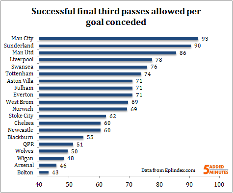 This is supported by the number of successful final third passes it takes the two clubs to score a goal; more than twice as many as the most efficient team, Blackburn.