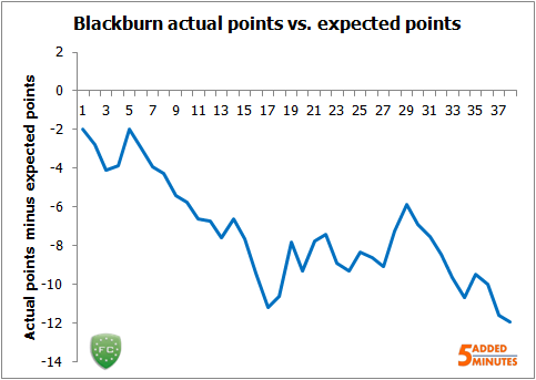 Over the entire season, Blackburn were never once been above their expected points total, drifting downwards towards eventual relegation. By Christmas (match 17) they were already 11 points below where the ECI predicted they would be.