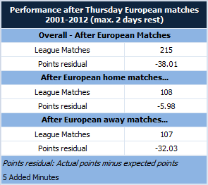 In 215 league matches after Thursday European matches since 2001, teams have scored over 38 points fewer than you’d expect. The effect is particularly pronounced after European away matches, where teams have scored 32 fewer points than expected.
