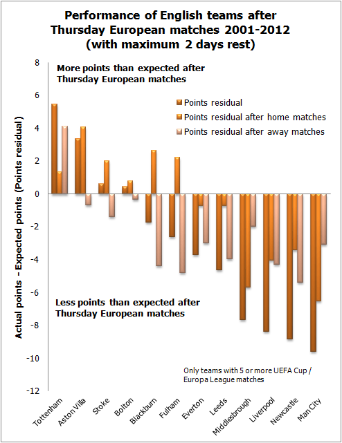 There is some variation by team, too. Curiously, Redknapp’s former team Tottenham have actually scored more points after European games since 2001, but it seems unlikely that this will hold over time.