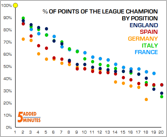 How does this compare with the rest of Europe? If we normalise the amount of points taken by the league champions, the number of points taken by the top seven teams in England is similar to Italy and France. Below this point, the Premier League resembles Spain’s La Liga, where roughly half the teams have roughly half the amount of points of the league champions, or less.