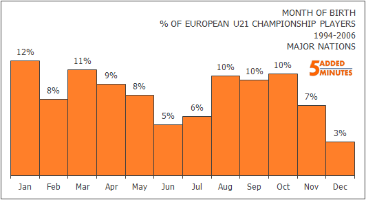 The cut-off for the Championships is on 1st January, 23 and a half years before the competition*. The theory argues that players born in December are less likely to be picked, having been left behind by their older, stronger peers.