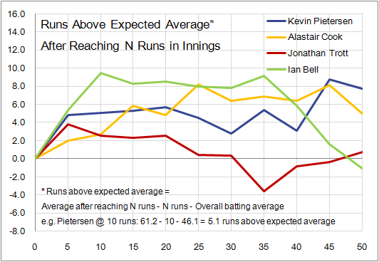 Similarly, once Alastair Cook has scored 25 runs, he tends to average higher than Kevin Pietersen, despite having a marginally lower average at the start of the innings. Having scored 45, Pietersen averages close to 100 runs per innings.
