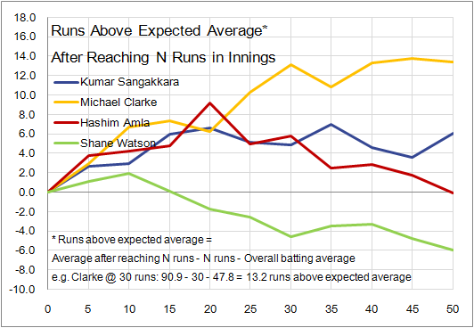 Having scored 30, Watson averages ‘only’ 60. This despite the fact he averages 35 when he comes to the crease. 60 – 30 – 35 = -5; Watson brings less runs than you’d expect having scored 30 runs. His captain Michael Clarke is the exact opposite, indeed his average is better than Sangakkara’s once both players have added 40 runs.