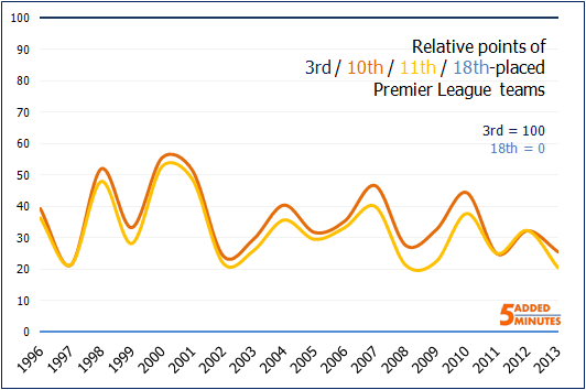 Indeed, in only 3 of the last 18 seasons has a team in 10th been closer to 3rd than 18th, and just once for the 11th-placed team