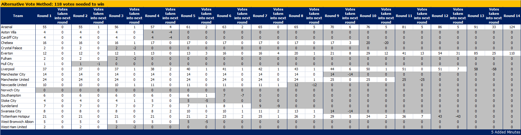 As you can see, Arsenal eventually beat Everton in Round 14, claiming 124 votes. Perhaps not a surprising result – though other methods, as we will see, produce different results that tend to favour teams with very few lower-preference votes.