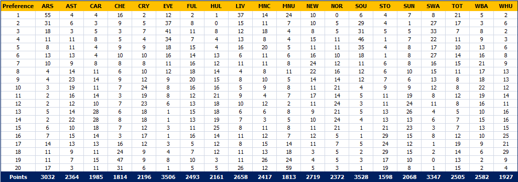The Borda Count is quite arbitrary in assigning a value to each vote – in the example above it’s perhaps more reasonable to assign a much greater weight to first preference votes, i.e. a voter’s favourite team. A number of respondents also told me that they didn’t really care about what order their ‘mid table’ choices were; the ‘intensity’ of preference across the votes needs to be considered.