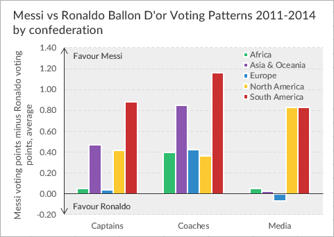 There is also a time factor to consider in all these analyses; in 2011 and 2012 Messi was the clear favourite, whilst in 2013 and 2014 Ronaldo was the frontrunner. In no vote has it been ‘too close to call’ – otherwise we might have an even truer reflection of the Messi-Ronaldo divide.