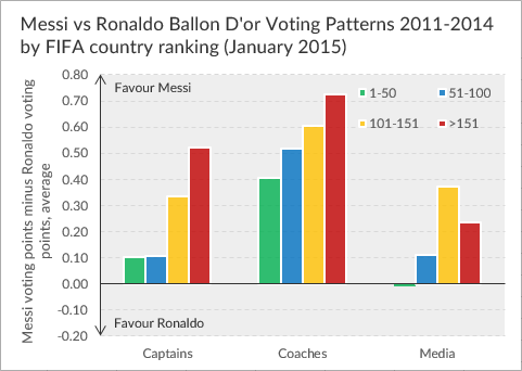 Another interesting relationship exists between the quality of teams and their voting preferences. As a rule of thumb, if you represent a stronger national team, you are less inclined to vote for Messi than if you were from a weaker nation.