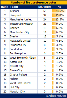 Each respondent was asked to rank the Premier League teams by preference, from their favourite team to their least favourite team. Historically, Manchester United have dominated these kind of polls, but whether due to the small sample (234 replies) or type of Twitter followers I have, Arsenal won 23.5% of the first preference votes in this example.